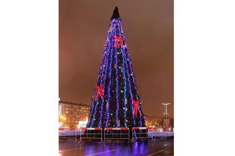 Для новогоднего оформления использовались разнообразные технологии и материалы. Панно за заборе ограждения выполнено из сотового поликарбоната с полноцветной печатью и накладными световыми элементами со светодинамическими эффектами. Фигурные композиции оформлены светодиодными гирляндами. Искусственные ели выполнены из каркасных стальных конструкций. Деревья декорированы пластиковыми шарами диаметром от 150 до 300 мм, светодиодными гирляндами и декоративными лентами.