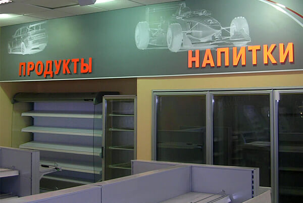 Пример оформления нашей компанией интерьера магазина с помощью фонового панно и объемных букв.